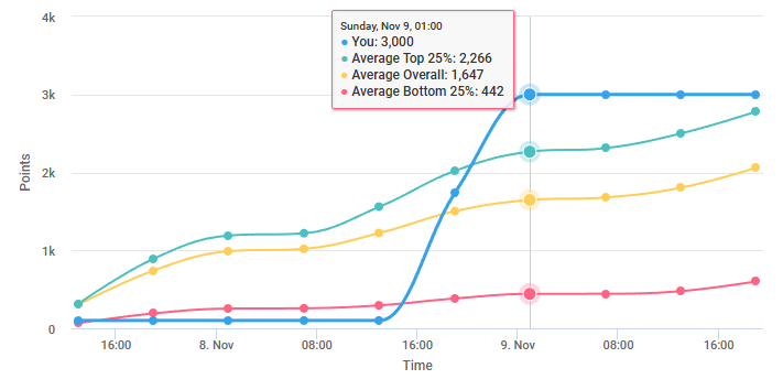 You may think we’re crazy for going this hard-core (and you’re probably right), but if you can’t stand getting a place other than 1st, we have found that This Is The Way. Note that little dot on the far top right is us - we were the only team that got 100% and 100% completion for Fall 2025 (Experienced Bracket), and we finished Saturday evening (ignoring the broken web challenge).
